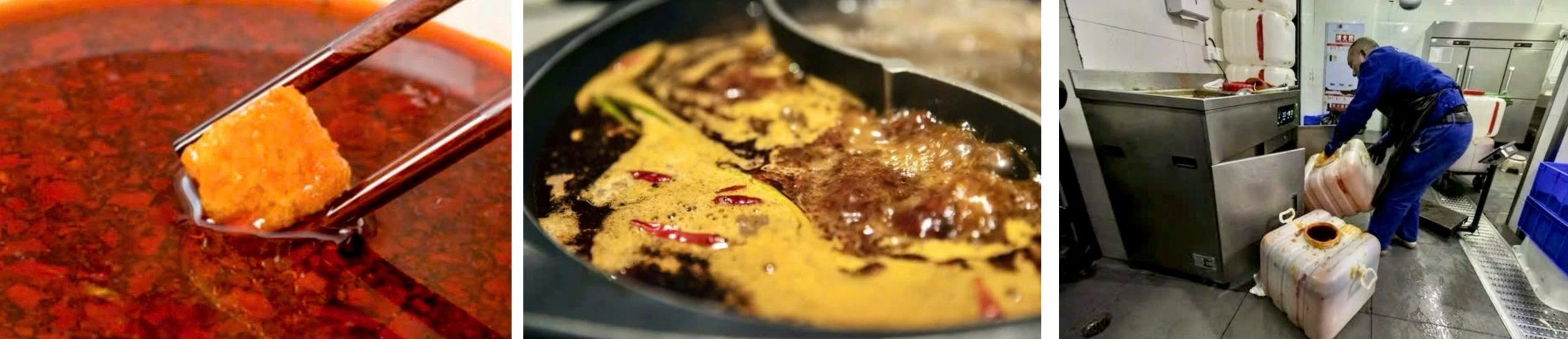 Hình ảnh dầu ăn từ lẩu và hình ảnh công nhân đang lấy thùng đựng dầu tại một quán lẩu ở thành phố Thành Đô, Trung Quốc
