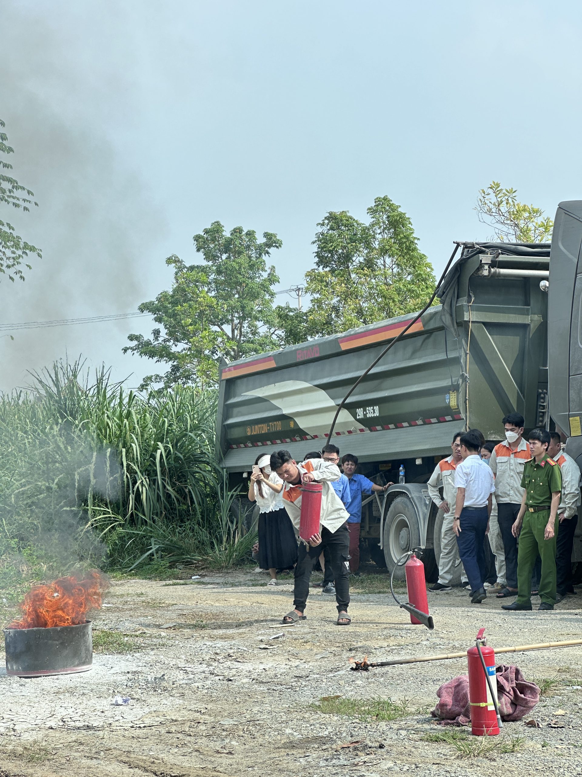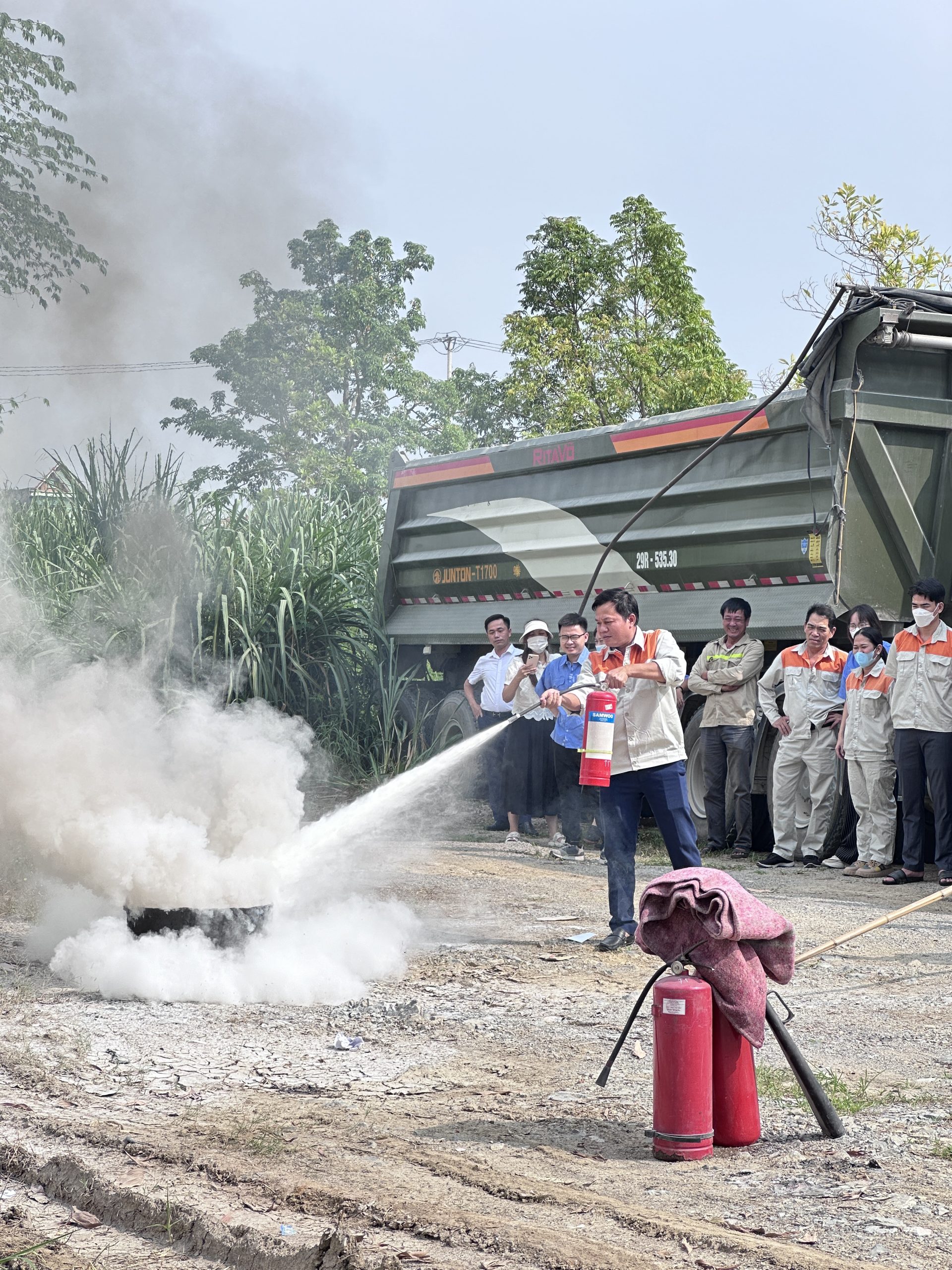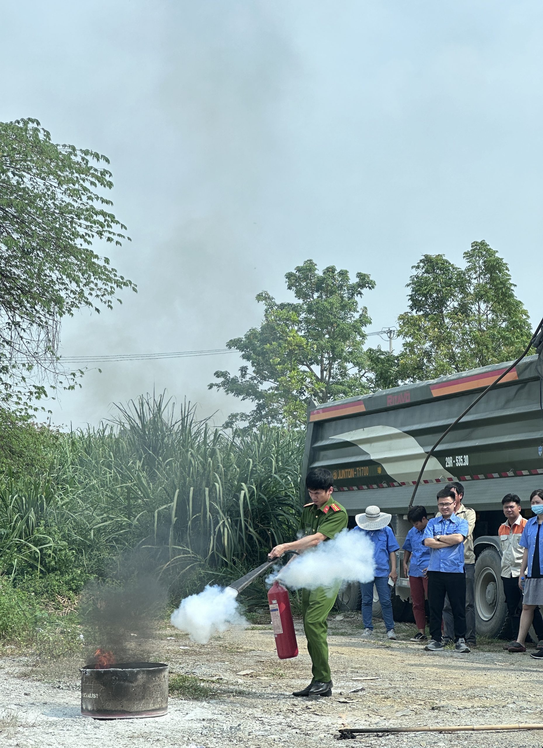 Hình ảnh cán bộ nhân viên GLOBE sử dụng bình cứu hỏa dập lửa tại buổi huấn luyện bồi dưỡng PCCC&CNCH định kỳ